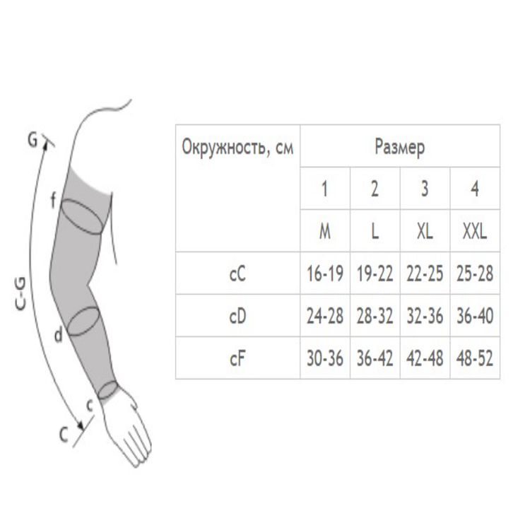Модель рукава выполнена по бесшовной технологии из эластичного медицинского трикотажа. Длина изделия - от запястья до подмышечной области. Рукав универсален, как для правой так и для левой руки.