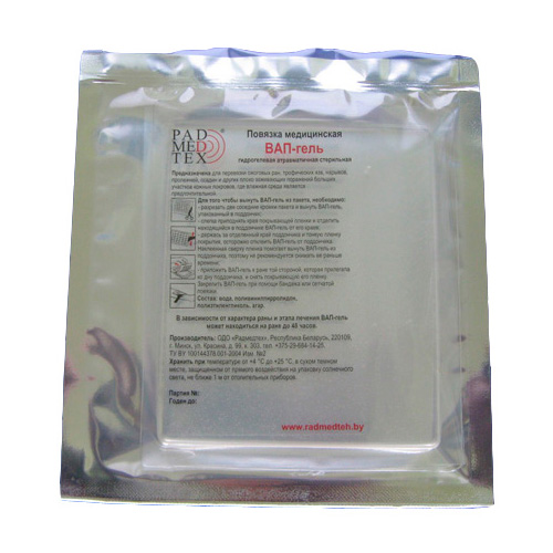 - Извлечь пластину ВАП-геля из упаковки и наложить на рану с захватом 0,5 см здоровой кожи от краев раны. Затем рана, покрытая ВАП-гелем, накрывается марлевой салфеткой и фиксируется пластырем или бинтом. Частота смены ВАП-геля – 1 раз в сутки или реже. Основное показание к смене повязки – помутнение гелевой пластины в результате насыщения экссудатом. Гель состоит из прочного полимерного механического биоматериала, при наложении принимает форму определенных участков человеческого тела.